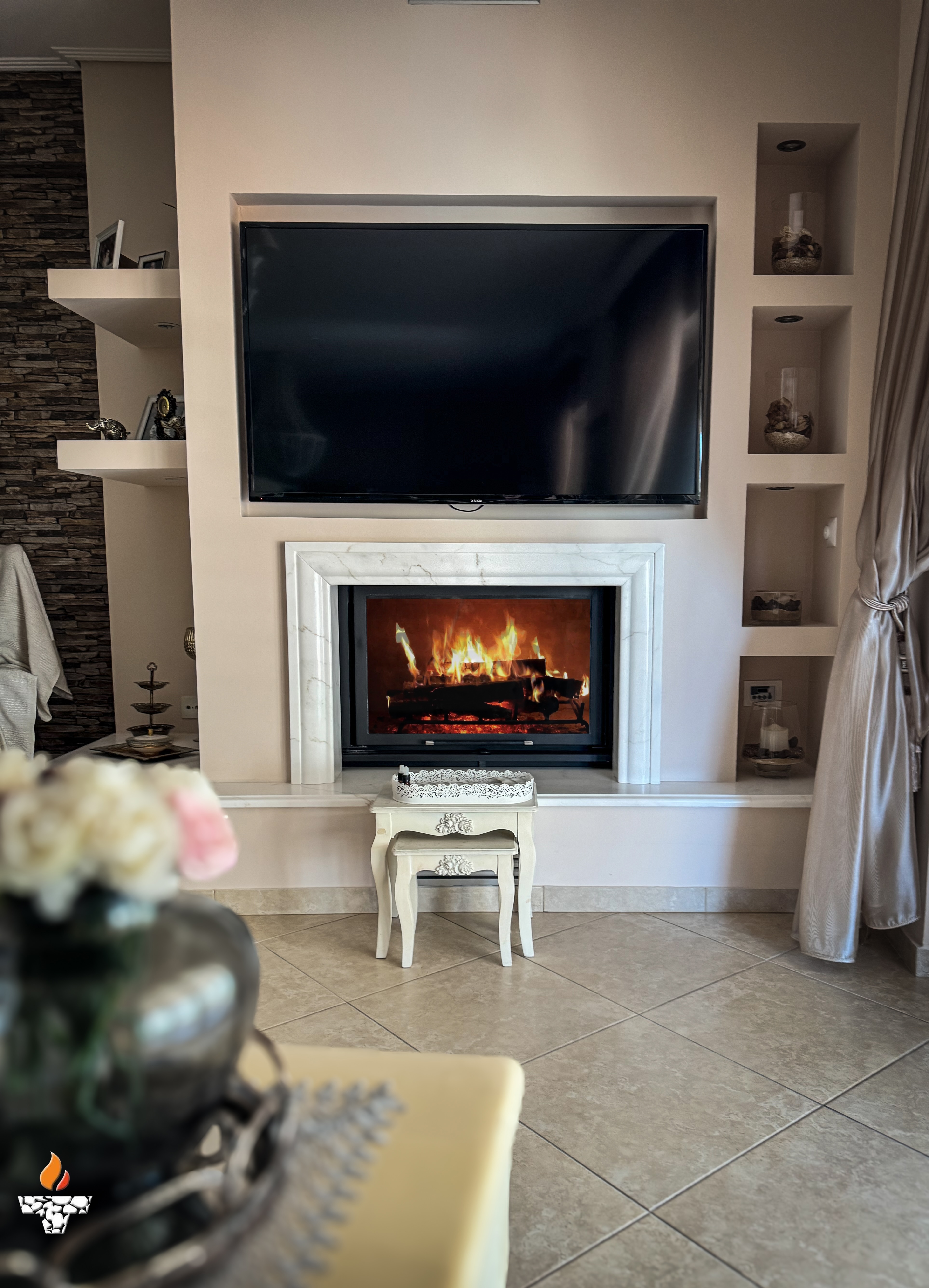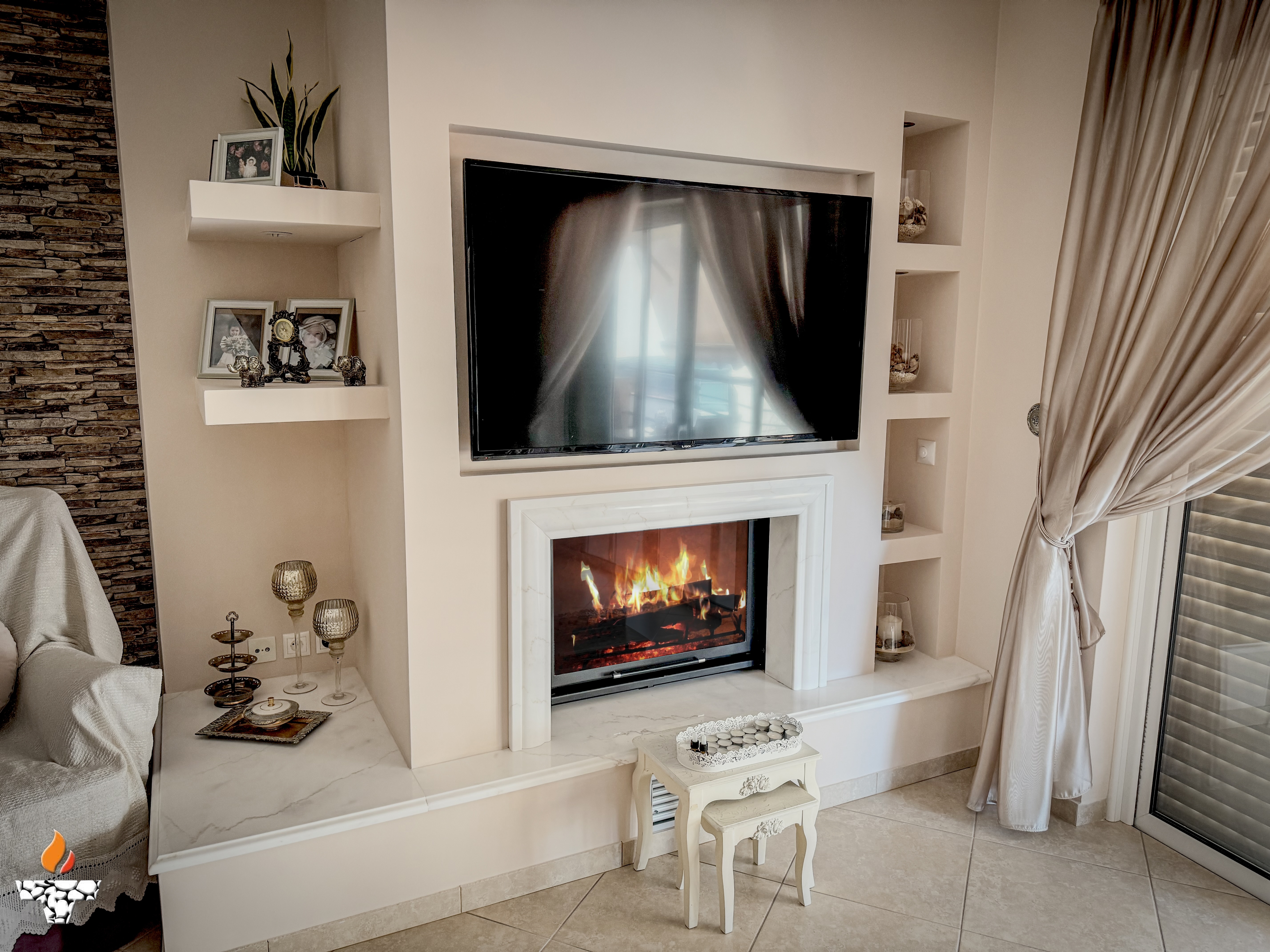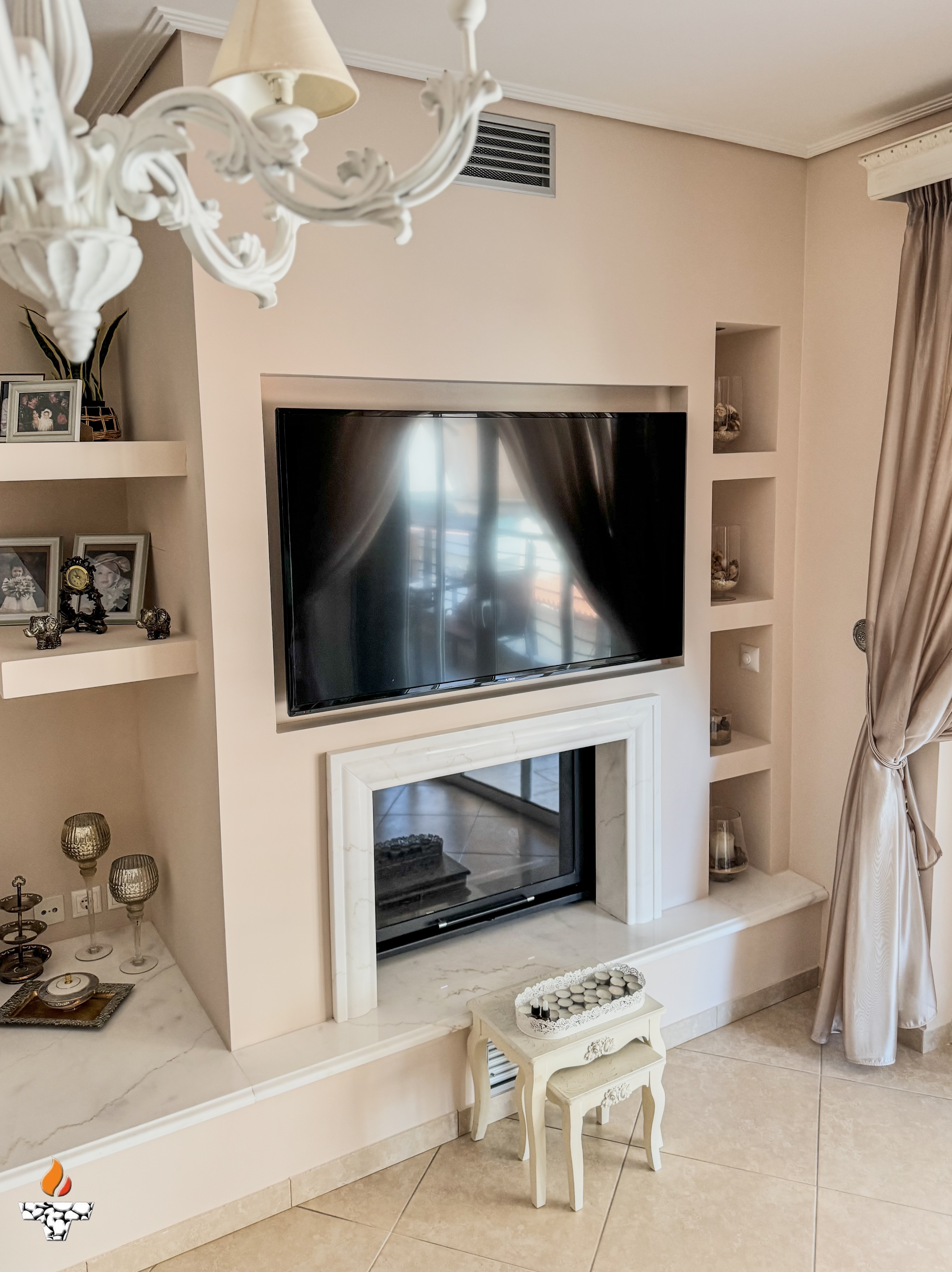 Σε κατοικία στον Πειραιά, αφού γκρεμίσαμε το παλαιό και μη λειτουργικό παραδοσιακό τζάκι τοποθετήσαμε ενεργειακό τζάκι καλοριφέρ Aqua900 με εξαφανιζόμενη πόρτα της ελληνικής εταιρείας Θερμοζέλ.