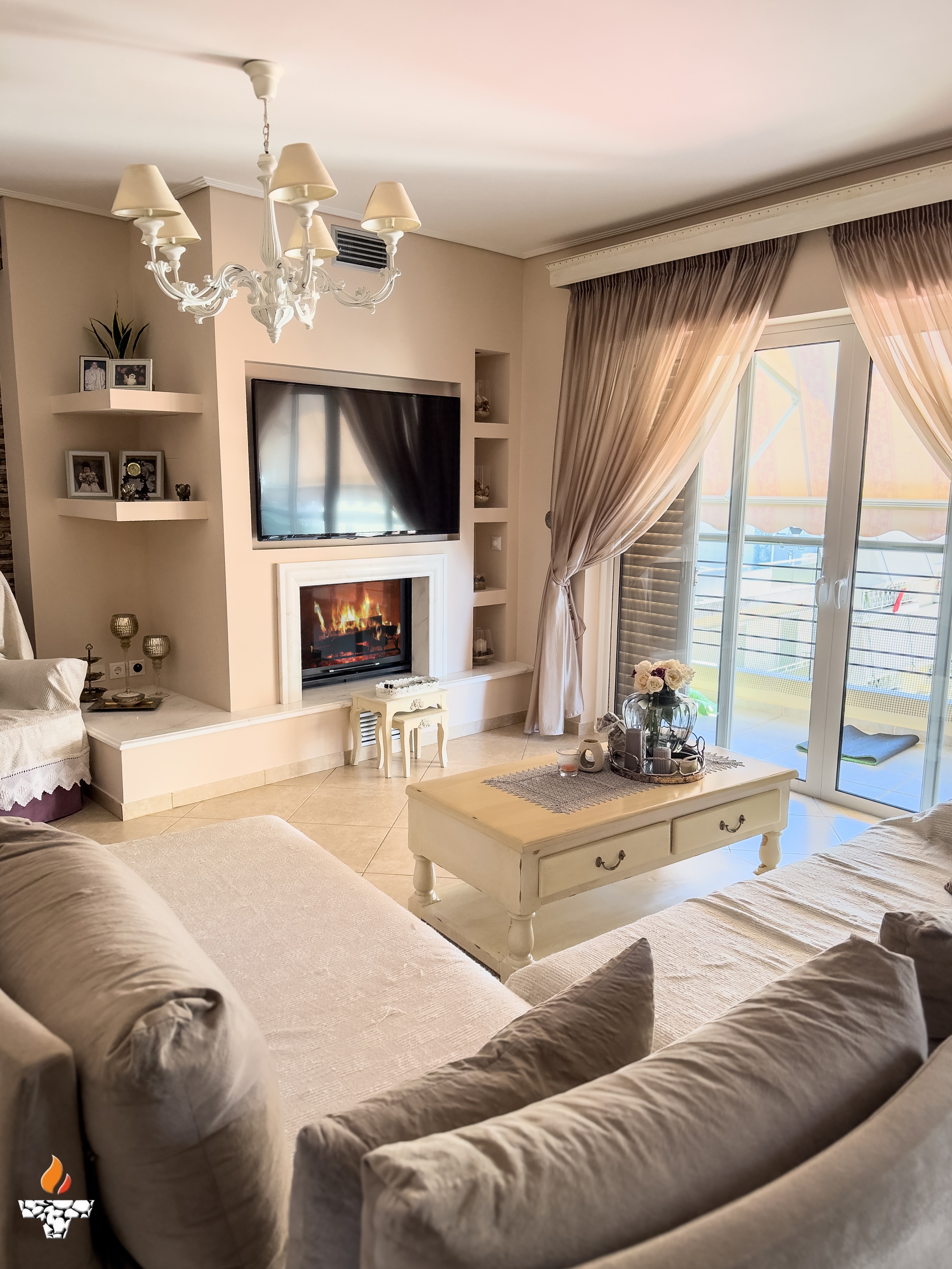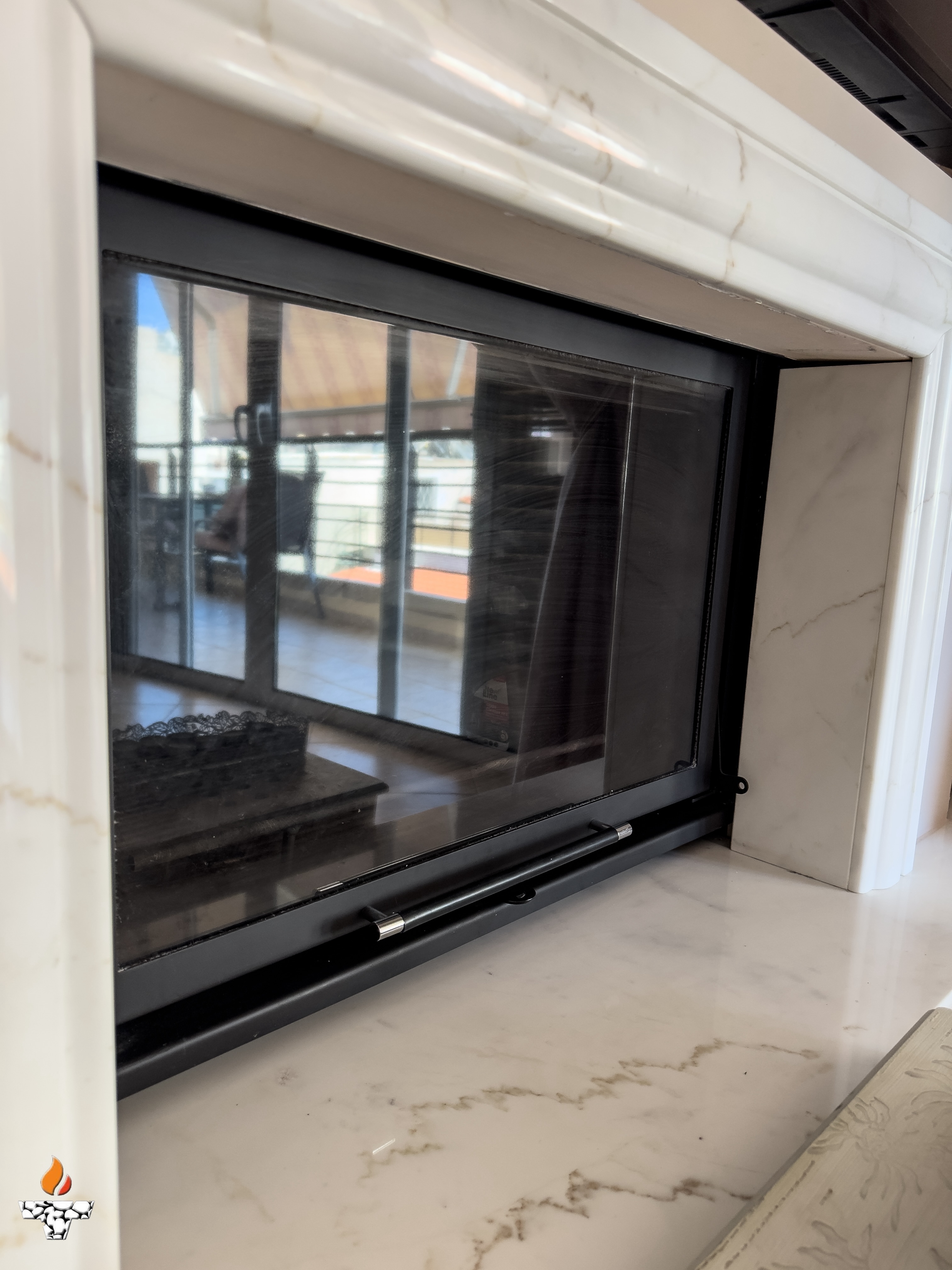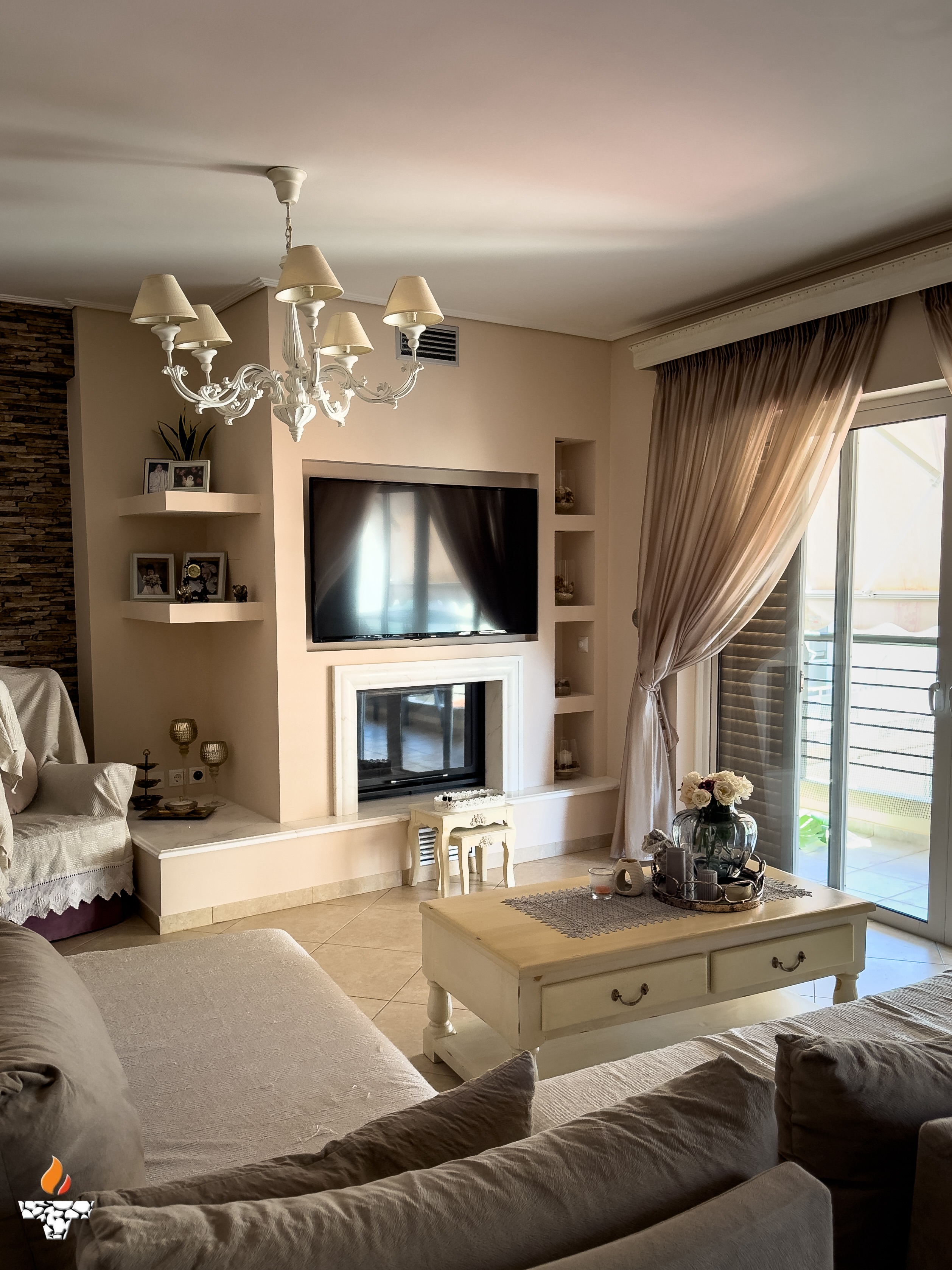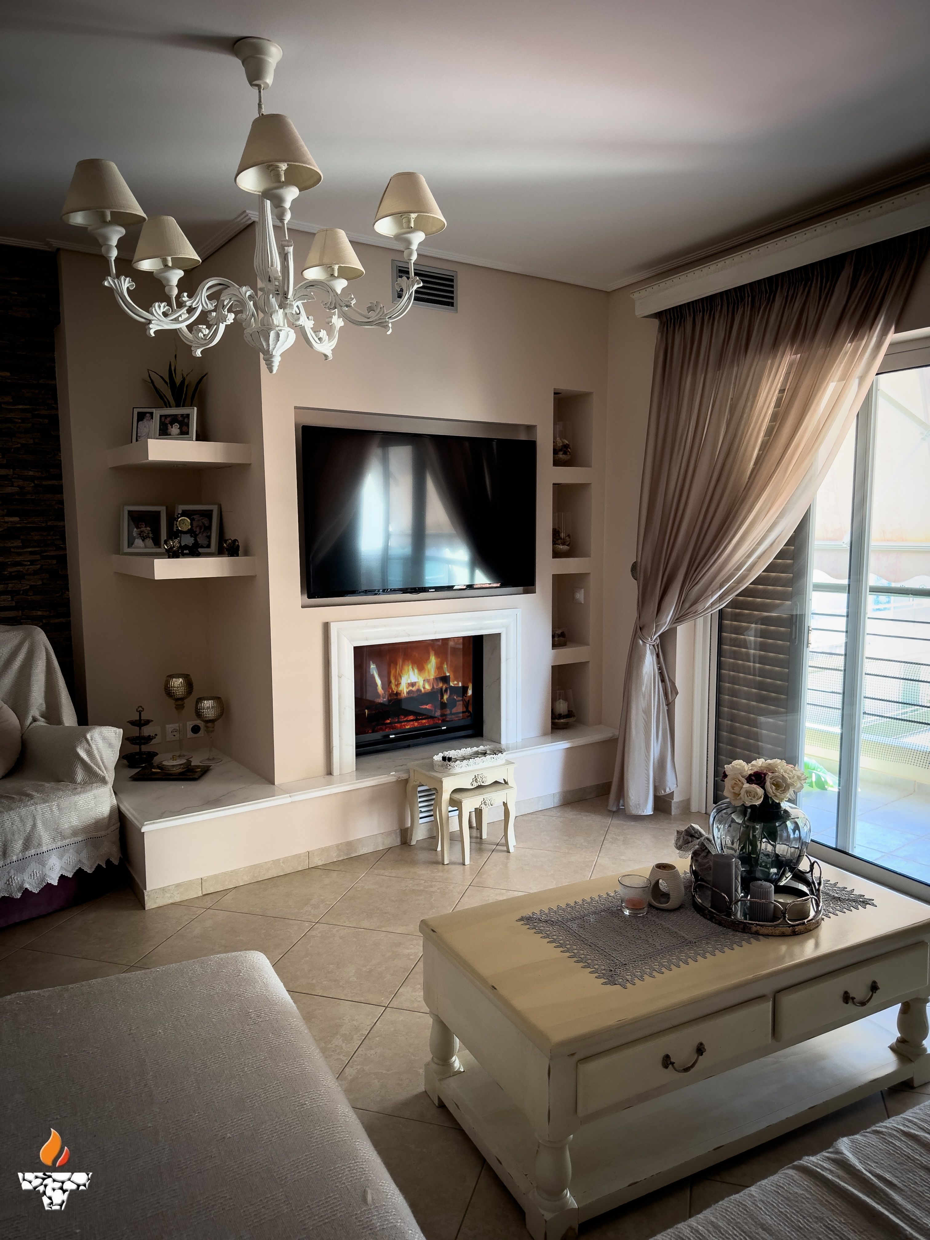 Σε κατοικία στον Πειραιά, αφού γκρεμίσαμε το παλαιό και μη λειτουργικό παραδοσιακό τζάκι τοποθετήσαμε ενεργειακό τζάκι καλοριφέρ Aqua900 με εξαφανιζόμενη πόρτα της ελληνικής εταιρείας Θερμοζέλ.